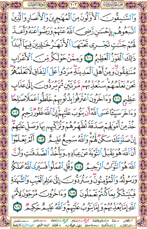 100–وَالسَّابِقُونَ الأَوَّلُونَ مِنْ الْمُهَاجِرِينَ وَالأَنصَارِ وَالَّذِينَ اتَّبَعُوهُمْ بِإِحْسَانٍ رَضِيَ اللَّهُ عَنْهُمْ وَرَضُوا عَنْهُ وَأَعَدَّ لَهُمْ جَنَّاتٍ تَجْرِي تَحْتَهَا الأَنْهَارُ خَالِدِينَ فِيهَا أَبَداً ذَلِكَ الْفَوْزُ الْعَظِيمُ